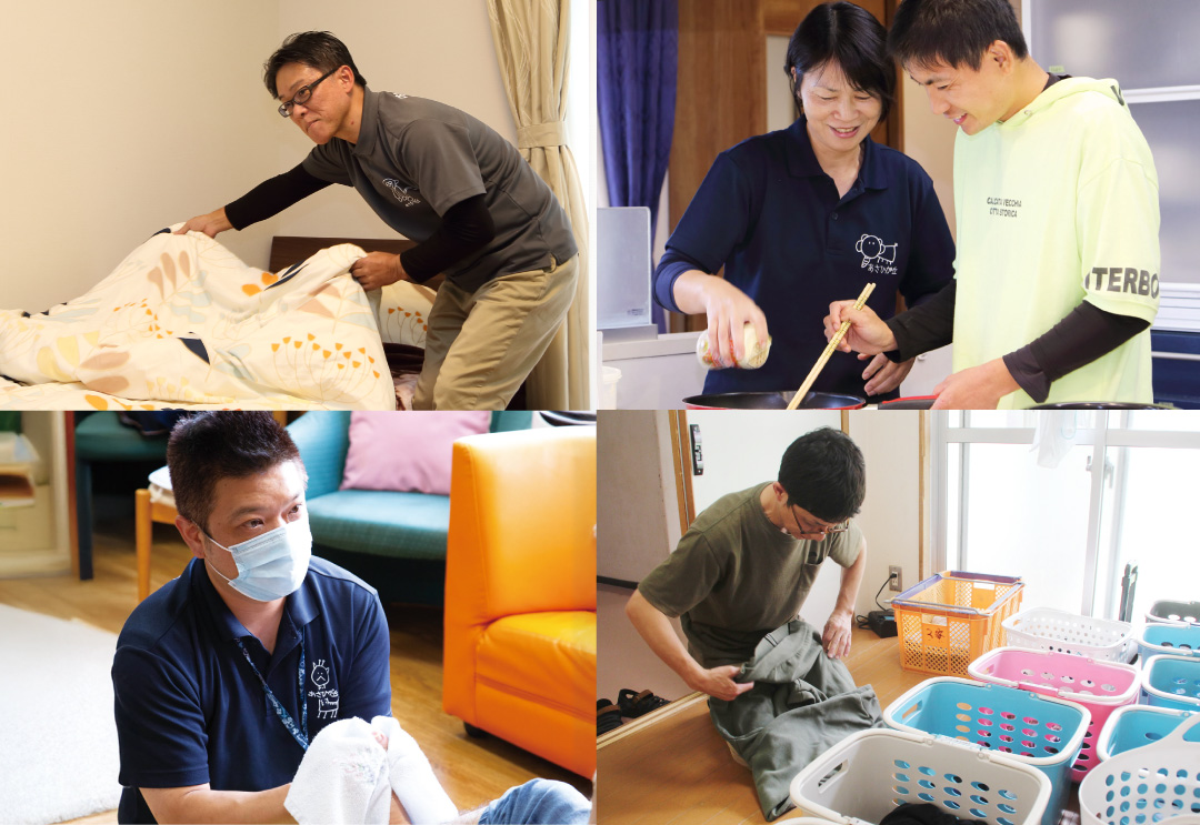障害者入所施設やグループホームでは、主に、心や体の機能発達・維持を図り、生活に必要な知識や技能を身に着け、一人ひとりが持てる力に合わせて、なるべく自立した日常生活を送れるよう、施設内で入浴、排せつ、食事等の生活介護やその他の日常生活上の支援、夜間の生活支援を行っています。